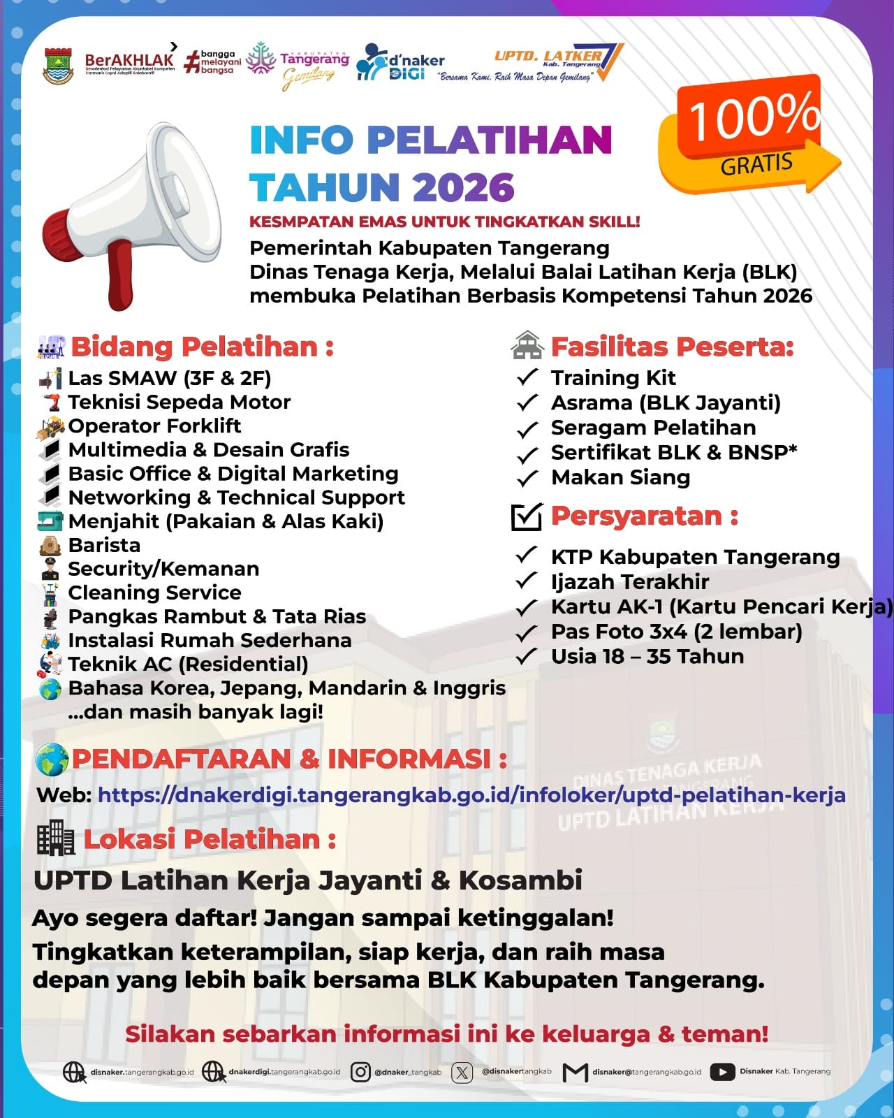 Link pendaftaran: https://dnakerdigi.tangerangkab.go.id/infoloker/uptd-pelatihan-kerja. (*)