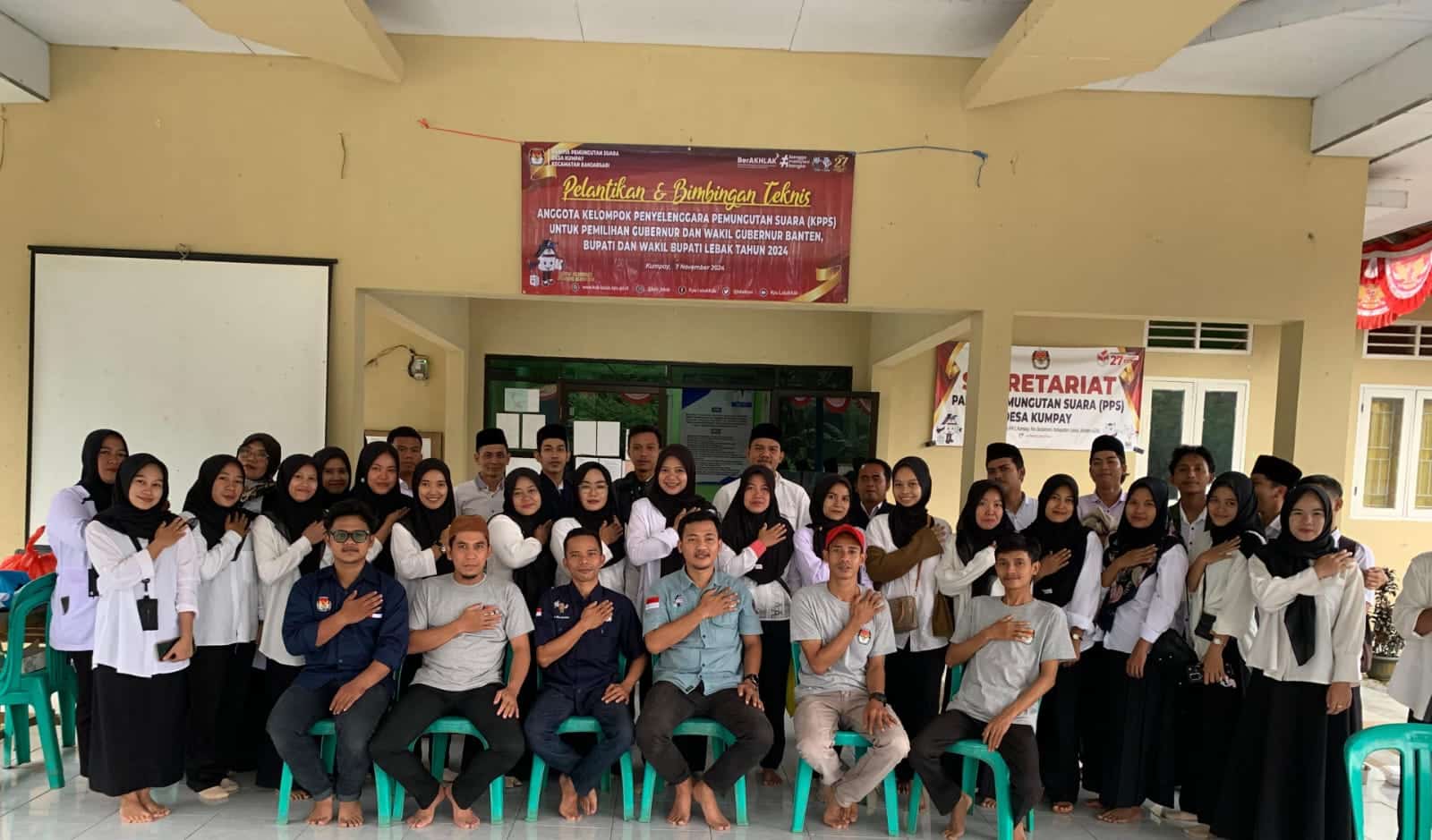 LEBAK | BD — Sebanyak 42 anggota Kelompok Penyelenggara Pemungutan Suara (KPPS) Desa Kumpay, Kecamatan Banjarsari, Kabupaten Lebak untuk Pilkada 2024 telah resmi dilantik pada Kamis, 7 November 2024. Pelantikan berlangsung di aula kantor Desa Kumpay.di bawah pengawasan anggota Panitia Pemungutan Suara (PPS).