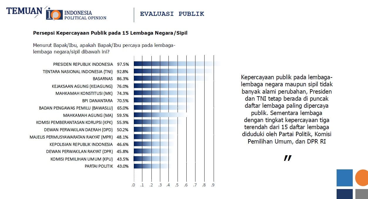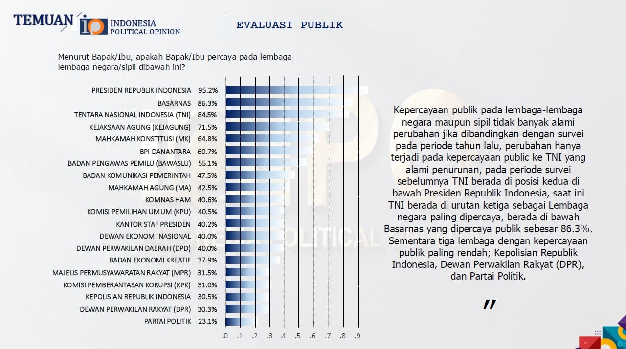 Dalam survei yang dilakukan pada 9–17 Oktober 2025, Presiden RI mencatat 95,2 persen, diikuti Basarnas (86,3 persen) dan TNI (84,5 persen). Sebaliknya, Partai Politik (23,1 persen), DPR (30,3 persen), dan Polri (30,5 persen) kembali menjadi tiga lembaga paling tidak dipercaya publik.