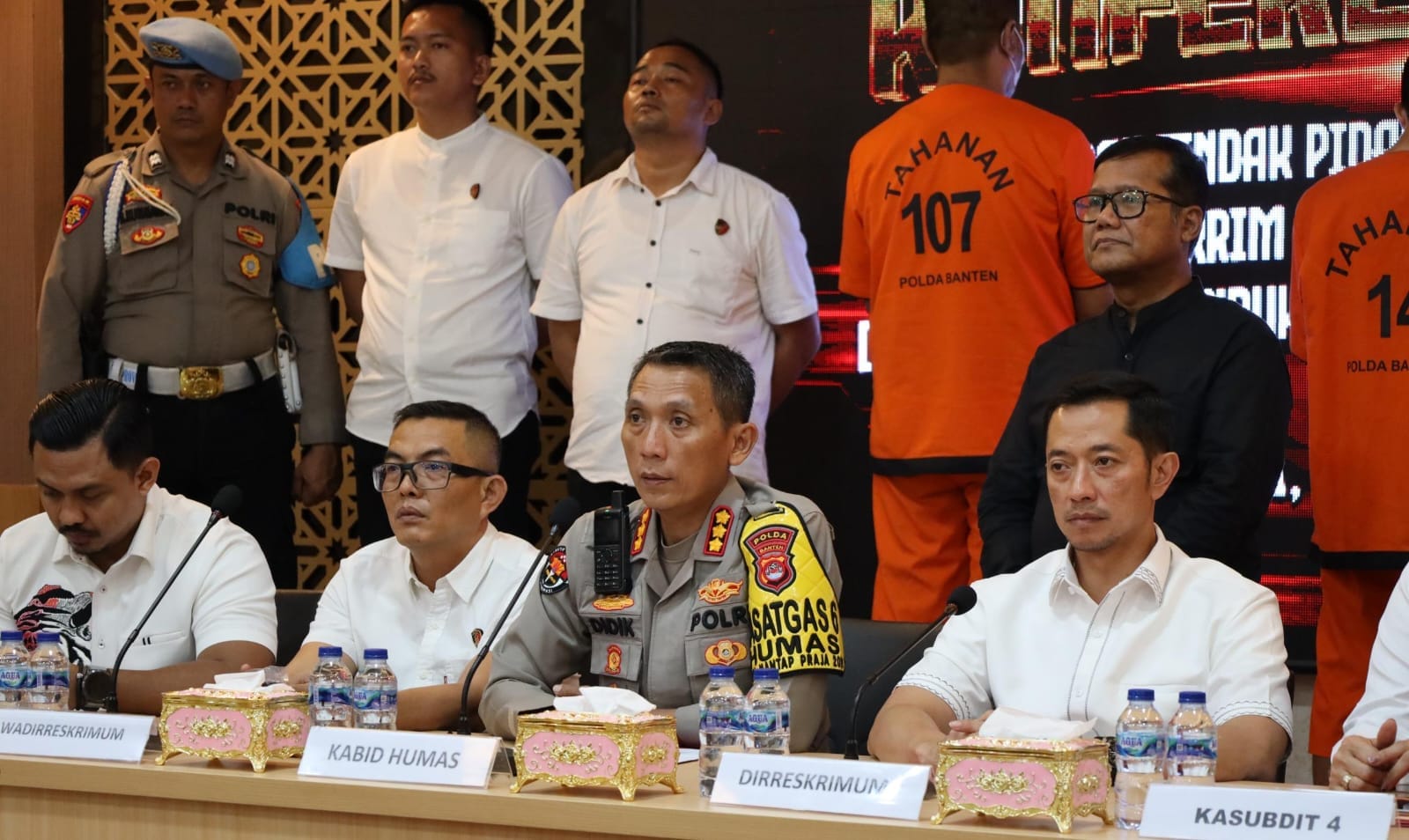 Konferensi pers Polda Banten, Jumat, 22 November 2024. (Foto: Ist)SERANG | BD — Polres Lebak berhasil mengungkap kasus Tindak Pidana Perdagangan Orang (TPPO) yang melibatkan seorang pria berinisial YA (26 tahun) di sebuah kontrakan yang dikenal dengan sebutan “kontrakan warna-warni” di Kecamatan Rangkasbitung. Tiga perempuan, yang masing-masing berinisial YA (27), YZ (20), dan DD (22), diduga terjebak dalam praktik prostitusi yang diatur oleh tersangka.